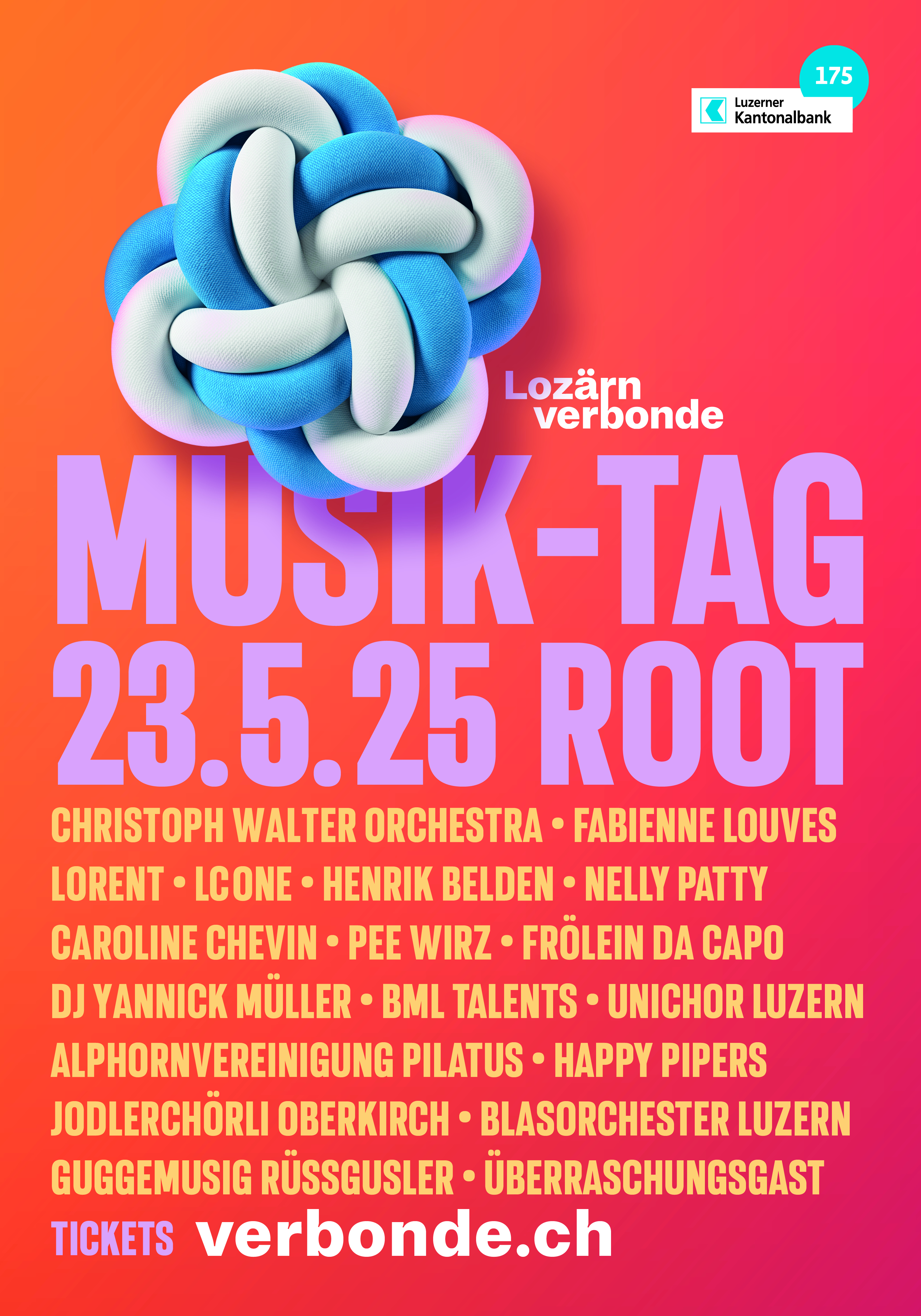 Am Freitag, 23. Mai 2025, ab 17.15 Uhr, führt die Luzerner Kantonalbank im Rahmen ihres 175-Jahr-Jubiläums den Musik-Tag in der Schwingerarena in Root durch. An diesem Abend findet ein einmaliges Musikerlebnis mit verschiedenen Luzerner Künstlerinnen und Künstlern statt. Der Eintritt ist für alle rund 8'000 Gäste gratis! Christoph Walter ist verantwortlich für das Programm der abendfüllenden Show. Auf der Bühne stehen bekannte Namen der Luzerner Musikszene wie Fabienne Louves, Lorent Berisha, Frölein Da Capo, Henrik Belden, Caroline Chevin, Nelly Patty, Pee Wirz, LCone oder DJ Yannick Müller. Aber auch Musikformationen aus den verschiedensten Genres sind Teil der Show: das Christoph Walter Orchestra, BML Talents, Unichor Luzern, Alphornvereinigung Pilatus, Jodlerchörli Oberkirch, Blasorchester Luzern, Happy Pipers und die Guggenmusig Rüssgusler. Man darf sich auf grosse nationale und internationale Hits in überraschenden Konstellationen aus den verschiedensten Genres von Pop, Rock, Rap über Volksmusik bis hin zu Guggenmusik freuen.