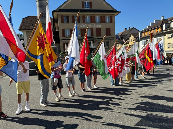 Bei strahlend heissem Wetter durften am Sonntag, 29. Juni 2025, der Gemeinderat mit Anhang und mehrere Schulklassen aus Root am festlichen Umzug durch das Städtli Sempach teilnehmen. Den Schülerinnen und Schülern kam dabei die besondere Aufgabe zu, am Umzug die Gemeindefahnen aller Luzerner Gemeinden zu tragen und mit ihnen auf der Kirchentreppe Spalier zu stehen für den Einzug der geladenen Gäste und Festakt-Besuchenden.