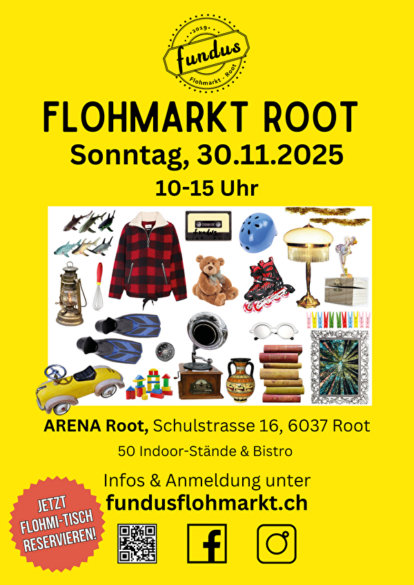 Der fundus Indoor-Flohmarkt findet in der Arena in Root beim Schulhaus St. Martin von 10-15 Uhr statt. Mit bis zu 50 Ständen gibt es genügend Platz für die verschiedensten Verkäufer aller Art. Hier finden Secondhand-Schätze ein neues Zuhause.